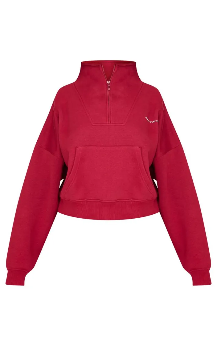 Take your off duty look to new heights with this petite burgundy graphic oversized half zip Sweatshirt. Brought to you in a burgundy hue material with a graphic detail, oversized fit and half zip fastening, this Sweatshirt is a must have. Style with the matching sweatpants, fresh kicks and simple accessories for a look like no other. It’s a yes from us.