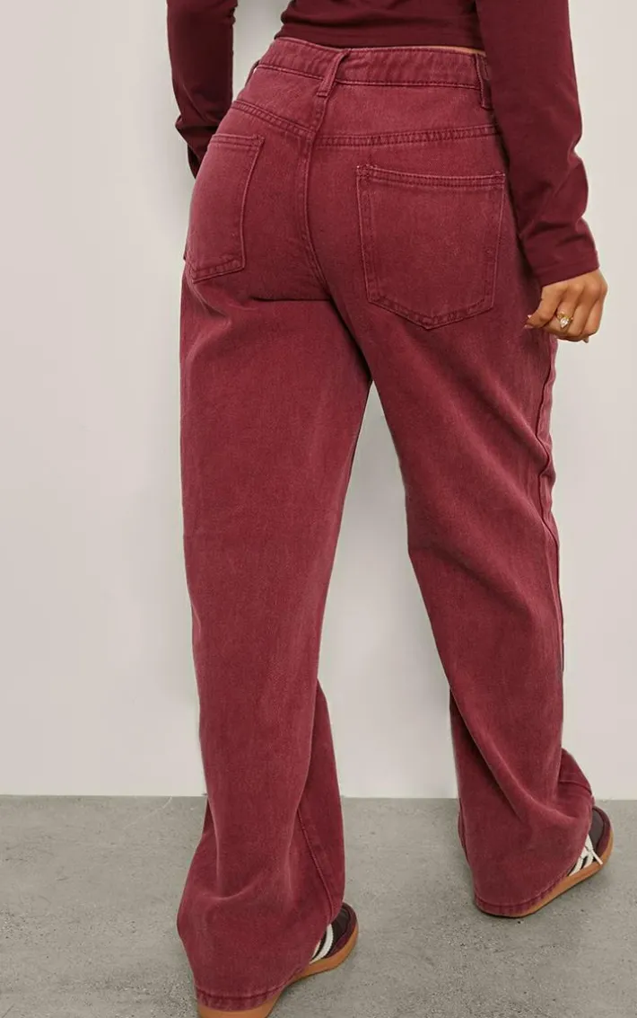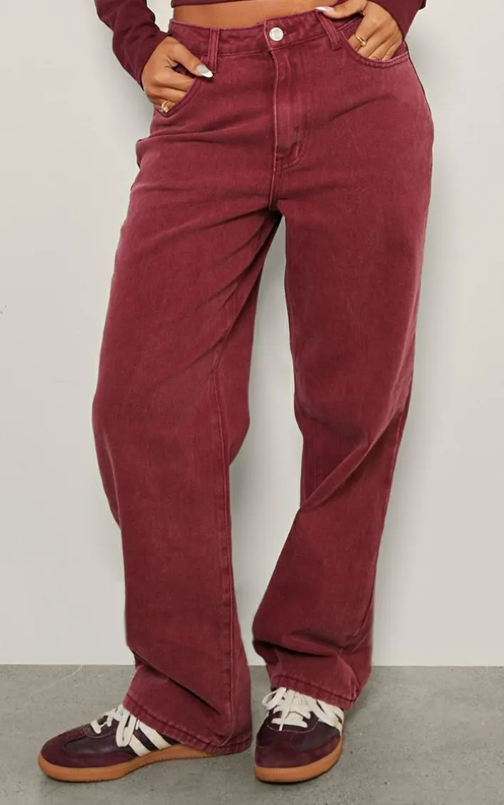 Your new season wardrobe is calling out for these petite burgundy washed high waist straight leg jeans. Brought to you in a burgundy washed material with a high waist fit and a straight leg design, you are sure to feel edgy this season and beyond. Team with your fave accessories and a pair of sneakers for a look like no other.
