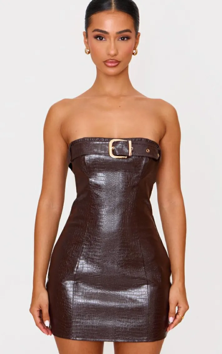 Keep it effortlessly chic with this petite chocolate croc faux leather belt detail mini dress. With its luxe chocolate tone, edgy croc design, faux leather material and flattering belt detail, this mini dress is a must have. Team with a pair of heels and simple accessories to complete the look.