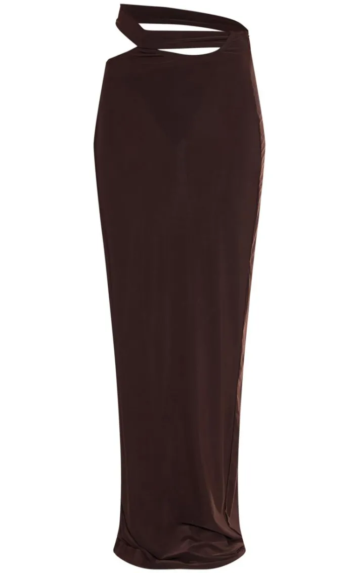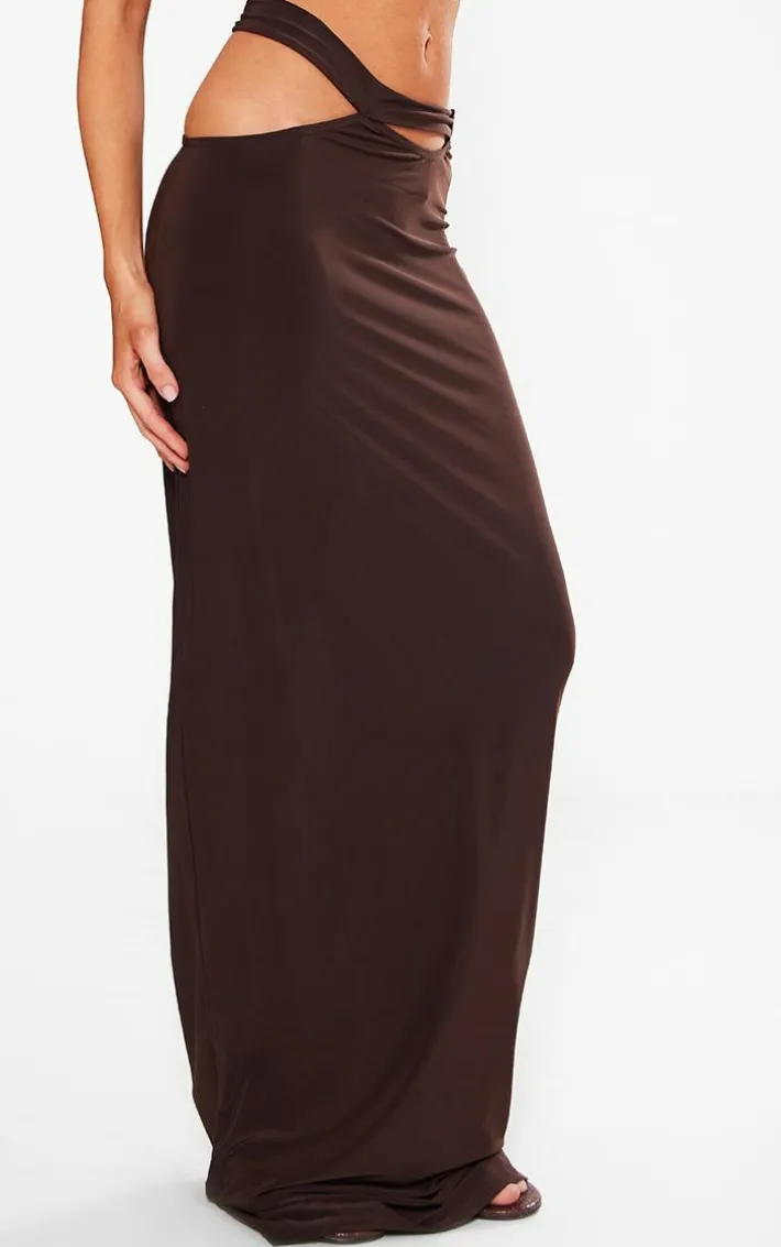 Make a statement with this petite chocolate slinky cut out waistband maxi skirt. Brought to you in a chocolate slinky material with a cut out waistband, we cannot resist. This maxi skirt pairs perfectly with a crop top and a pair of your highest heels, it’s a yes from us.