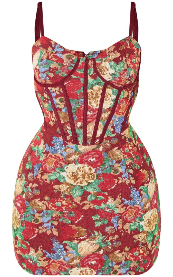 Add some new season prints to your wardrobe with this petite dark red floral jacquard strappy mini dress. Whether you’re off out with the girls or looking for a date night ‘fit, you’ll look flawless in its corseted top design, mini dress cut and timeless jacquard fabric. Let this dress do the talking by pairing with slip-on heels and your go-to accessories.