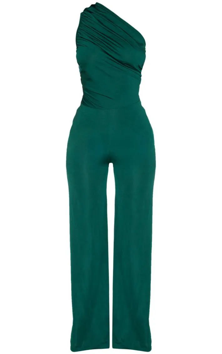 You are sure to steal all the stares with this must-have jumpsuit. Featuring an emerald green material with a one-shoulder design, a ruched detailing and a wide-leg fit, we are in love. Pair with a mini bag, high heels and accessories to secure the glam.