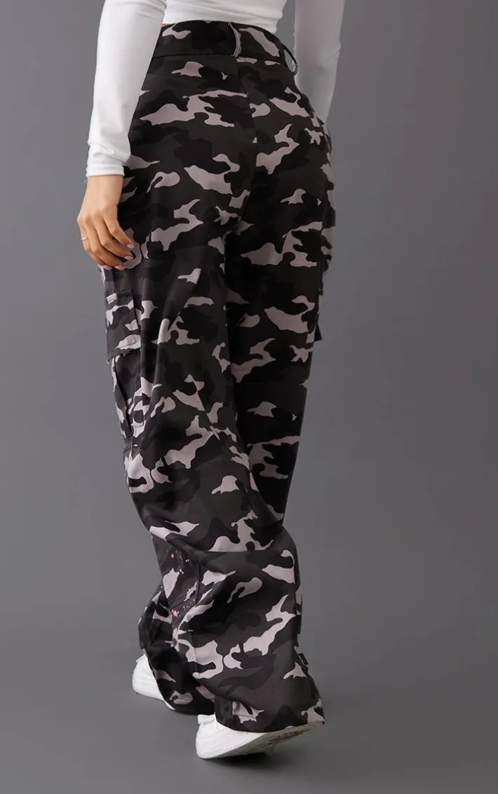 Get ready to earn all the style points with these must-have petite grey camo paint splatter cargo pants. These cargo pants are the perfect piece for styling up for the weekend or grunging down for an unreal off-duty look. In a super chic grey material with a camo paint splatter design and a cargo style. Simply pair these petite pants with a white crop top, a faux leather jacket and fresh sneakers for a look that is totally on trend.