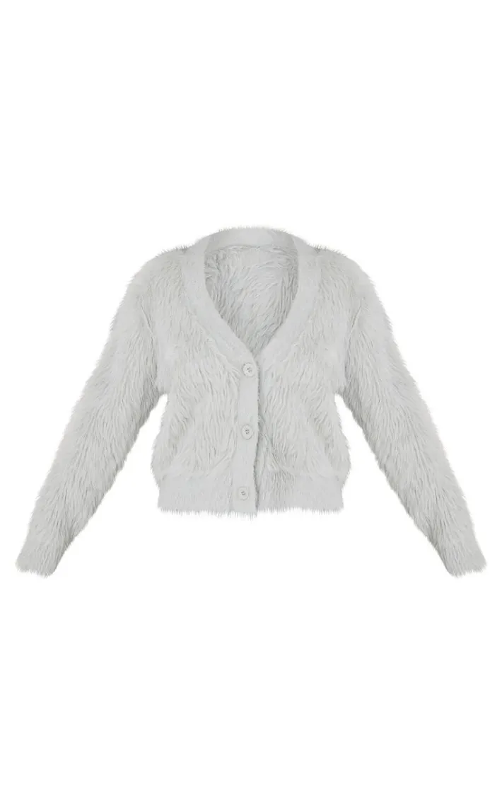 Introducing your new go-to cosy season layer, the petite grey fluffy knit v neck cardigan. We’re in love with its fluffy grey hue fabric, v neck cut and button down cardigan design. Whatever the weather, you’ll be looking on point when styled with wide leg pants, chunky sole shoes and your biggest silver hoops.