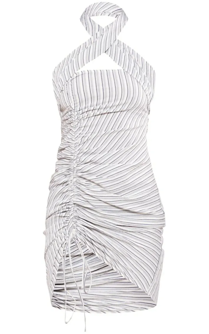 Give your wardrobe a seriously chic update with this petite grey stripe textured wrap neck ruched bodycon dress. This dress is brought to you in a grey textured material with a wrap neck design that will add some luxe vibes to your look. With a wrap neck and a ruched detail, this bodycon dress is all you need to amp up your wardrobe. Team with some of your fave shades and some chunky sandals for an on trend look we are loving.