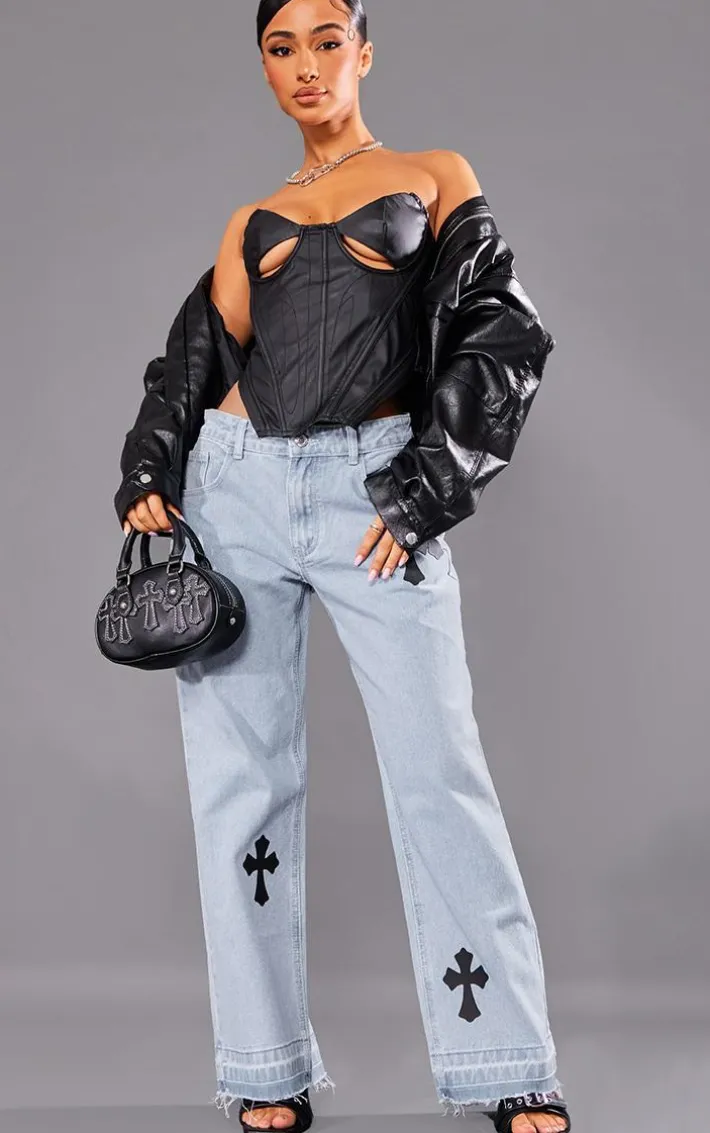 Give your denim collection a fierce edge with these petite light blue wash cross applique straight leg jeans. They are made from a light-blue denim material with cross applique detailing and a straight-leg fit, what’s not to love? Perfect for those upcoming weekend plans, these petite jeans are a yes from us. Wear with a corset top and your fave heels for a look we just can’t get enough of.