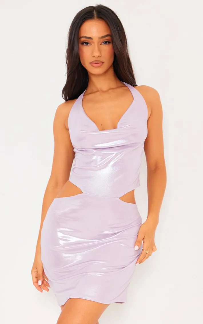 You are guaranteed to make heads turn in this petite lilac metallic cowl neck mini cut out dress. Brought to you in a lilac hue metallic material with a cowl neckline, cut out detailing for that extra touch of drama and a mini fit, how can you not be obsessed? Style this petite dress with clear strap heels and statement accessories for a weekend-worthy look to be remembered.