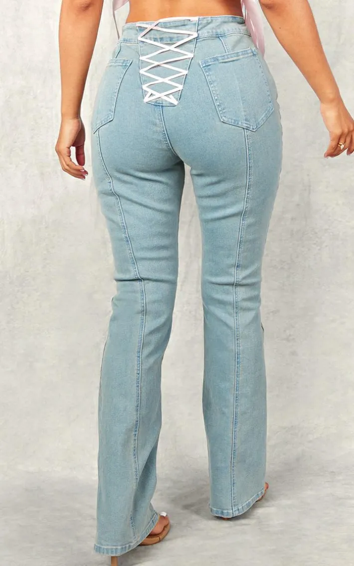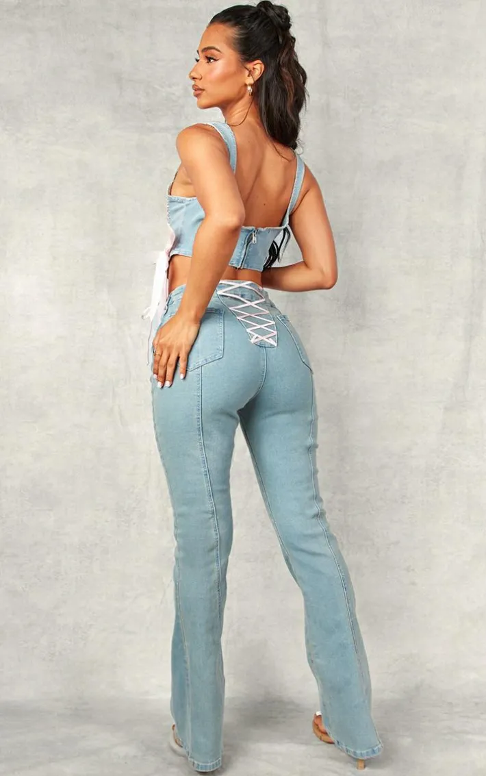 Set major trends this season with these petite mid blue wash denim flares with ribbon details. Brought to you in a mid blue wash denim material with a flared design and a ribbon detailing, what more could you want ? These flares will have you feeling effortlessly chic all season long. Team with your fave accessories and the matching corset top for a fool proof finish we are obsessing over.