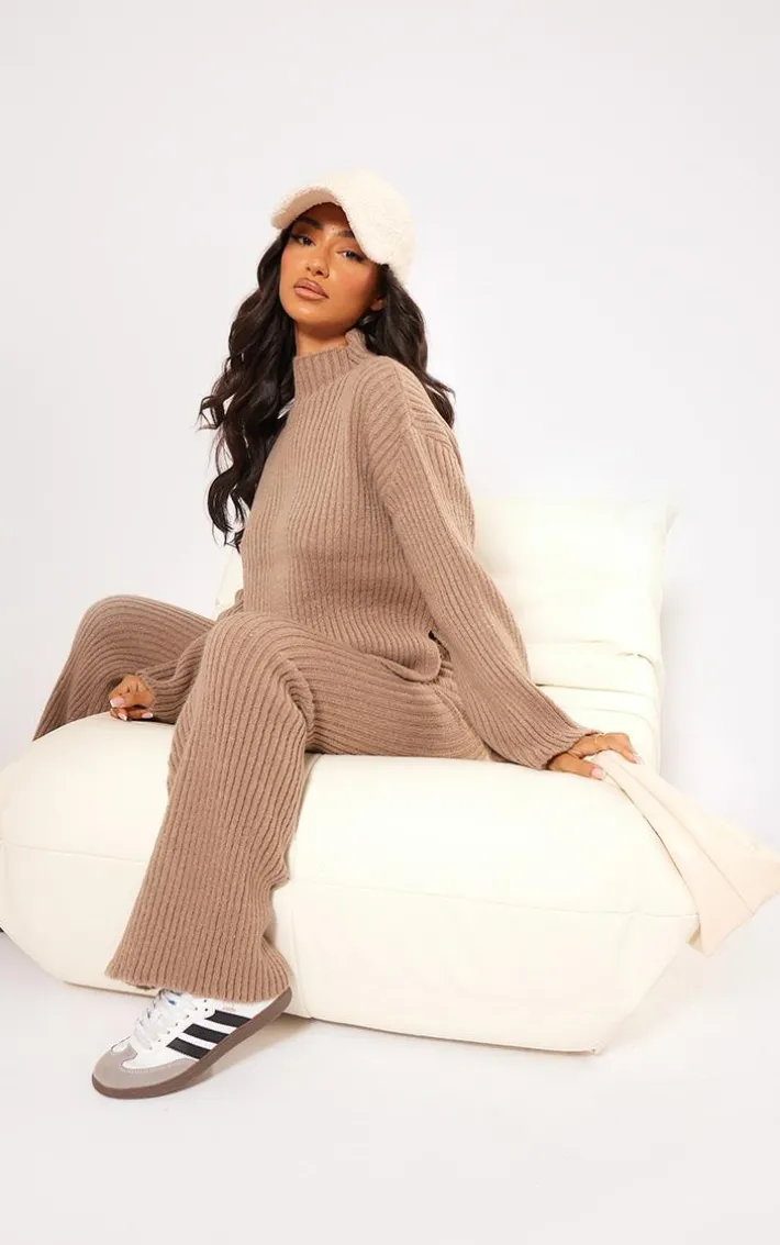 Take your everyday styling to the next level with these petite mocha rib knit wide leg pants. These pants are brought to you in a mocha ribbed knit material with a wide leg fit and a high waist, how could you turn this down? Complete the look and style this with the matching top, chunky boots and accessories for a look like no other