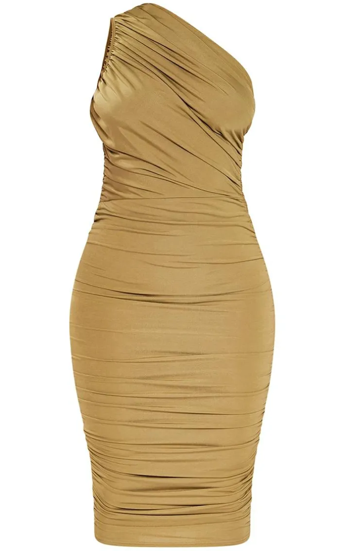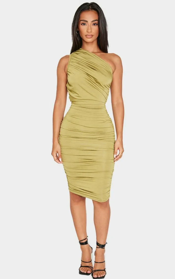 this dress is sure to have all eyes on you. Featuring an olive slinky material with ruched detailing and a one shoulder design. Style with slip-on heels and hoop earrings for a dreamy date night look.