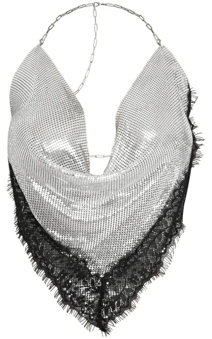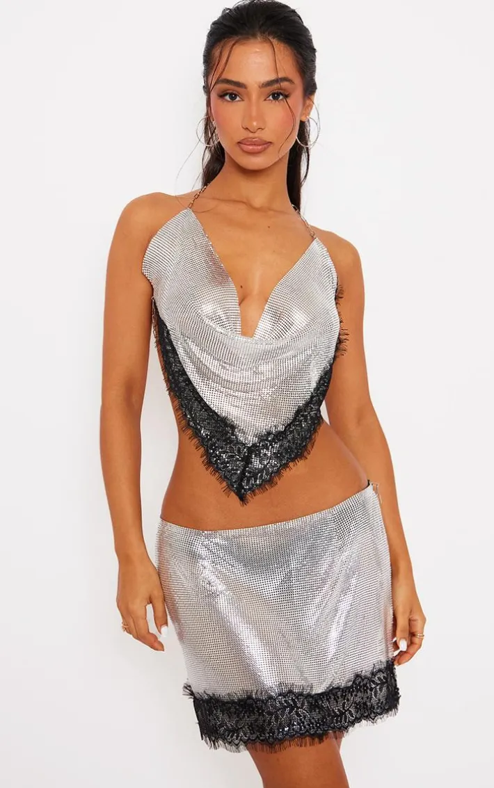 Steal all the stares this weekend with this petite silver lace detail chainmail crop top. Made from a silver chainmail material with lace trim detail and a cowl halter neckline, what’s not to love? This petite crop top is sure to turn heads for all the right reasons and we know you won’t be able to say no to all the compliments. Team with the matching mini skirt, clear heels and silver accessories for a look that won’t go unnoticed.