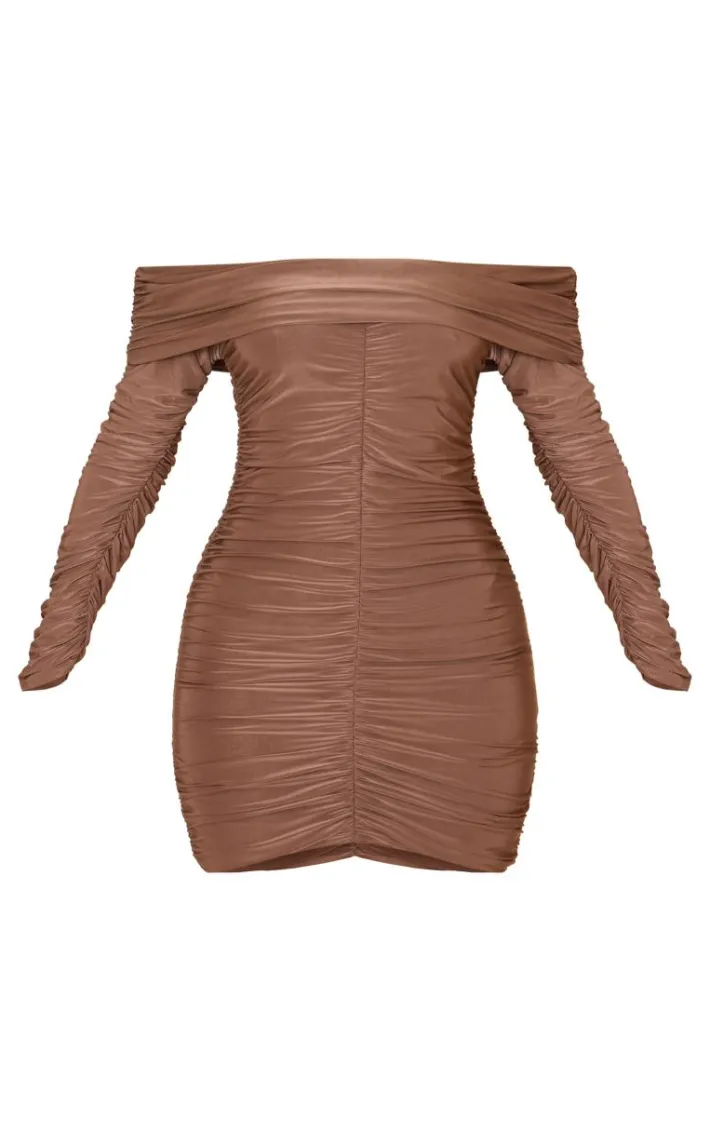 This petite taupe double slinky asymmetric bardot ruched mini dress is here to solve all of your ‘what to wear’ dilemmas this weekend. Brought to you in a taupe double slinky material with an asymmetric bardot neckline and ruched detailing, what more could you want? Style this mini dress with knee length heeled boots and simple gold accessories to elevate the look.