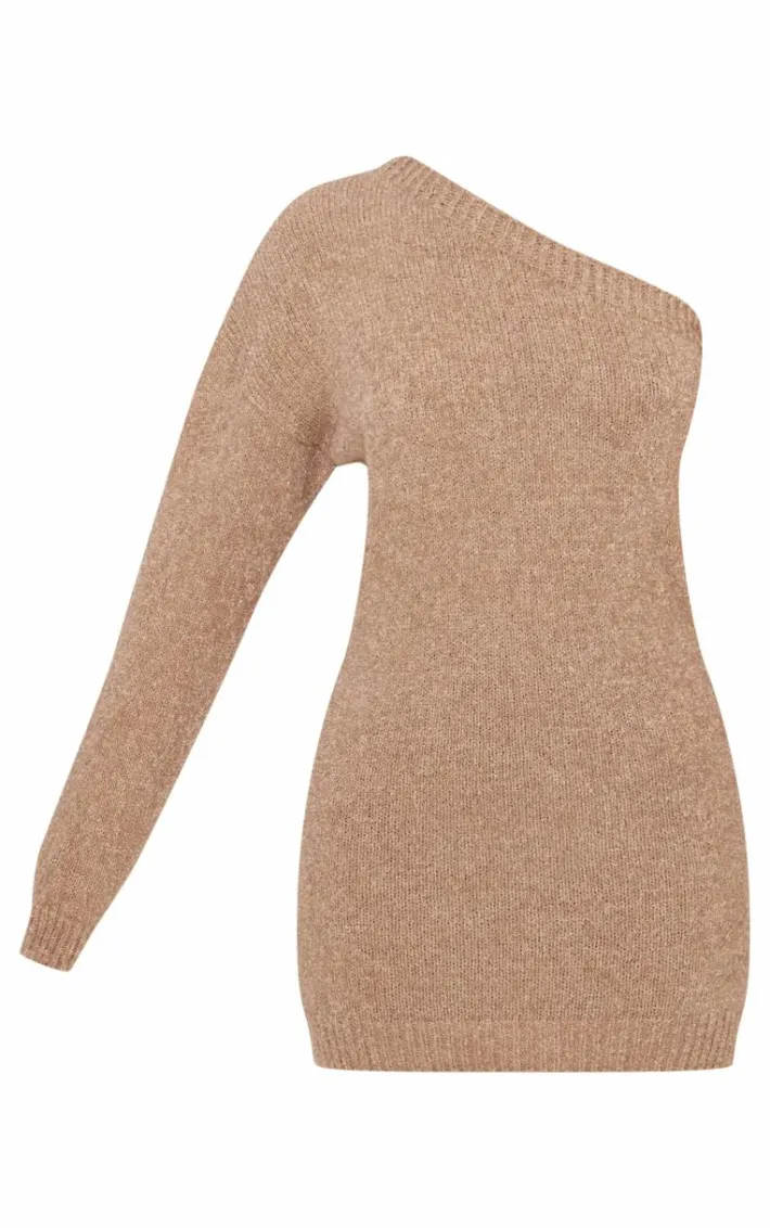 Add this petite taupe knit one sleeve mini dress to your collection for a look you’ll be reaching for again and again. Brought to you in a neutral taupe shade, with a luxe knit material and flattering one sleeve design, this mini dress is all the new you need. Style with a pair of knee length boots and simple accessories to really make an impact.