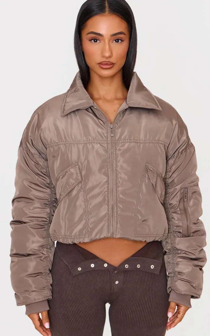 Throw this petite taupe ruched sleeve bomber jacket on this weekend for a look like no other. With its neutral taupe tone, edgy ruched sleeve design and bomber style, this jacket deserves to be bagged. Team with a pair of brown leggings and sneakers to complete the look.