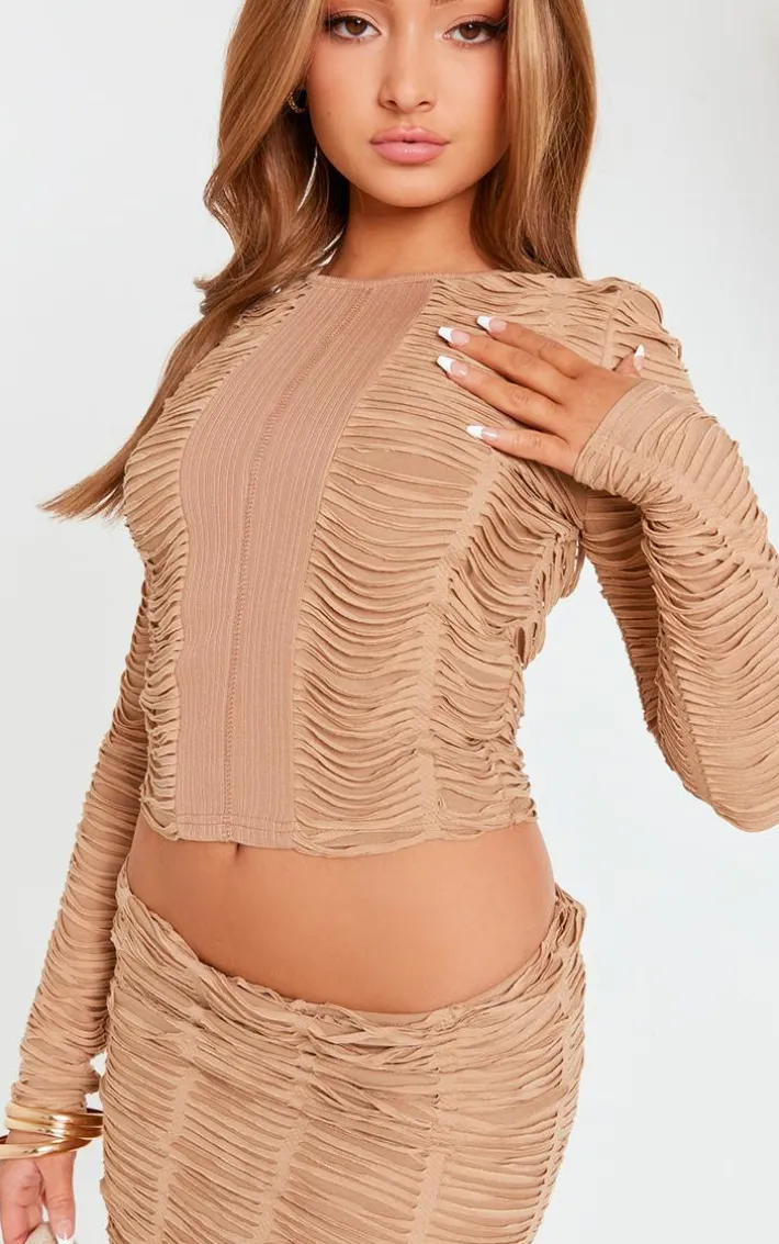 Switch up your weekend style game with this petite taupe textured jersey long top. Brought to you in a taupe hue textured jersey material with long sleeves and a longline fit, what more could you want? Style this petite top seamlessly with the matching skirt, clear strap heels and gold accessories for a look that is sure to steal all the stares.