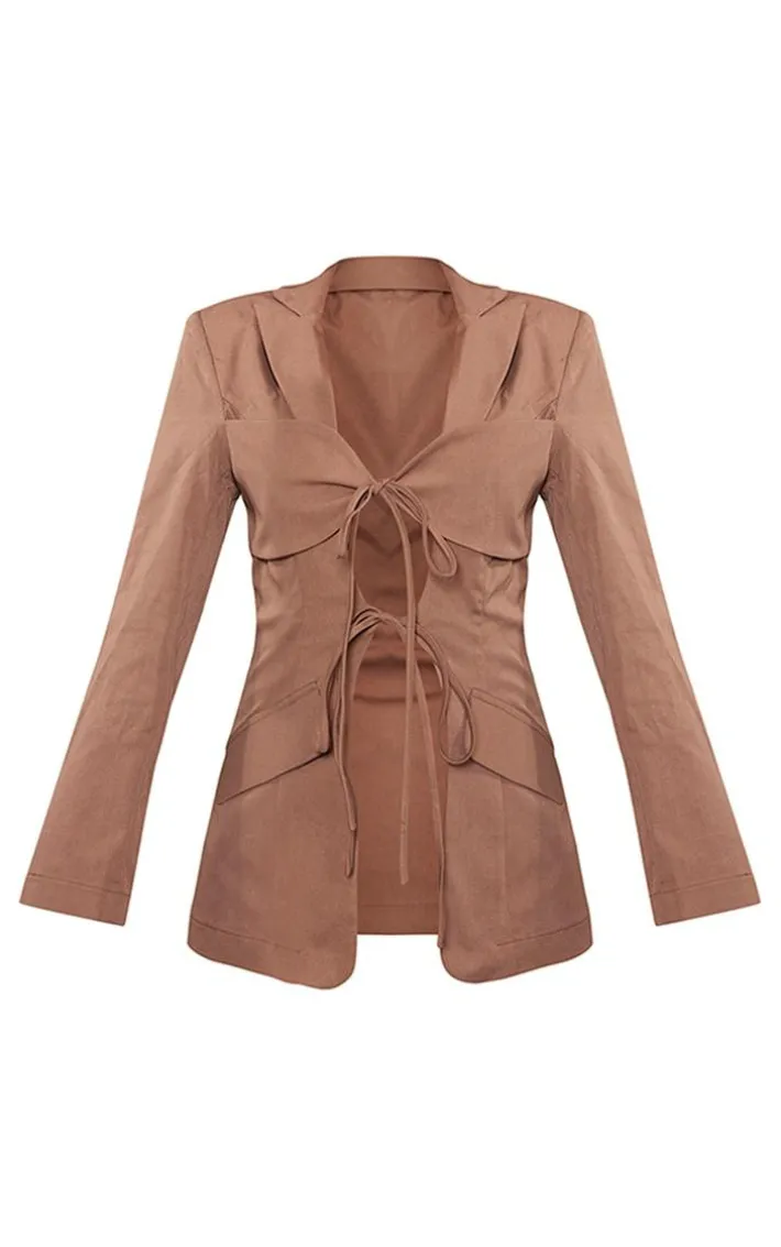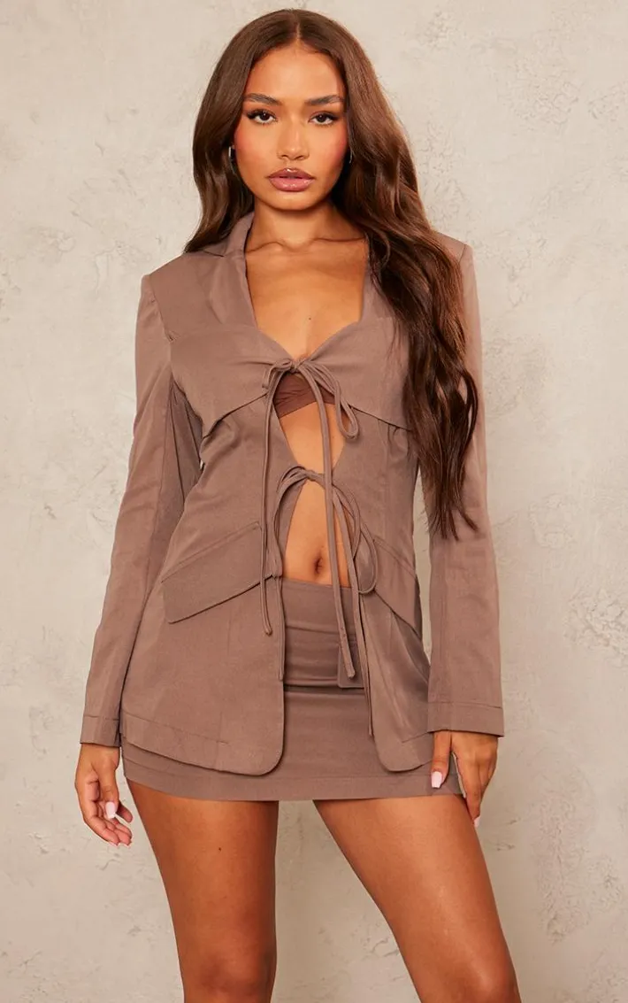Get your glam on with this petite taupe tie detail fitted blazer. Made from a taupe material with tie detailing and a fitted design, you’re sure to have all eyes on you. When the weekend calls so does this blazer. So what are you waiting for? Shop the look and opt for the matching mini skirt, high heels and accessories. This blazer will have you setting trends wherever you step foot.