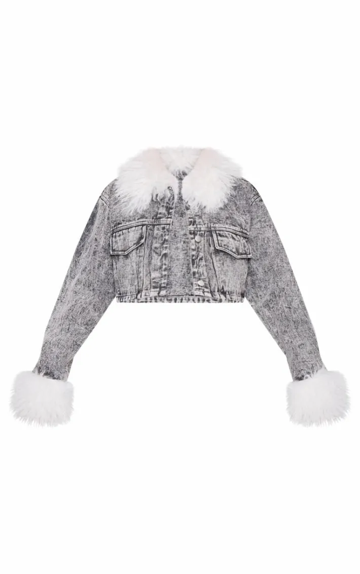 Opt for this petite washed black denim cropped jacket with fur trims for a new season statement. Brought to you in a must have washed black hue, with a denim material, cropped design and fur trim detailing, how can you not love? Style with the matching mini skirt and knee length boots for a look that won’t go unnoticed.