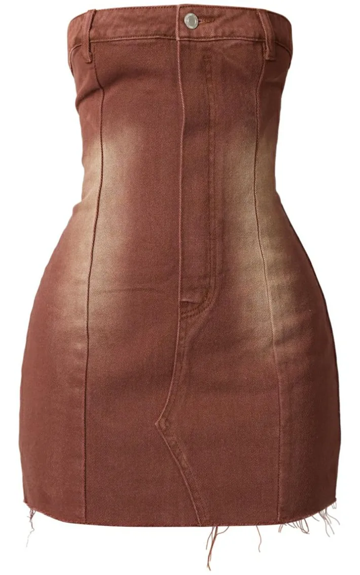 Enter the new season in style with this petite washed brown denim mini dress. Brought to you in a washed brown hue denim material with a bandeau neckline and a flattering mini fit, we just can’t get enough. Perfect for AM to PM styling, this petite mini dress is sure to become a staple in your weekend wardrobe. Style with a chunky belt and clear strap heels for a fool-proof finish to your weekend look.