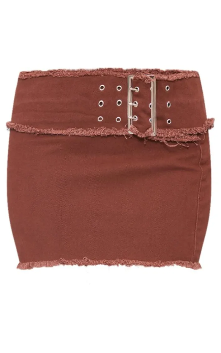 Stay on-trend for the new season and beyond with this petite washed brown frayed belt detail denim mini skirt. Brought to you in a washed brown denim material with a frayed belt design and a mini fit, how can you day no? Style this petite mini skirt with a crop top and bold hue heels for a look that is sure to earn you some serious style points on your next night out.