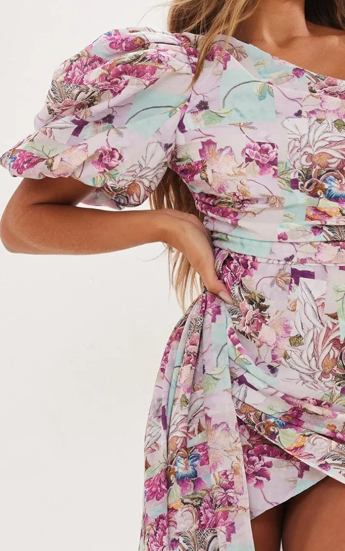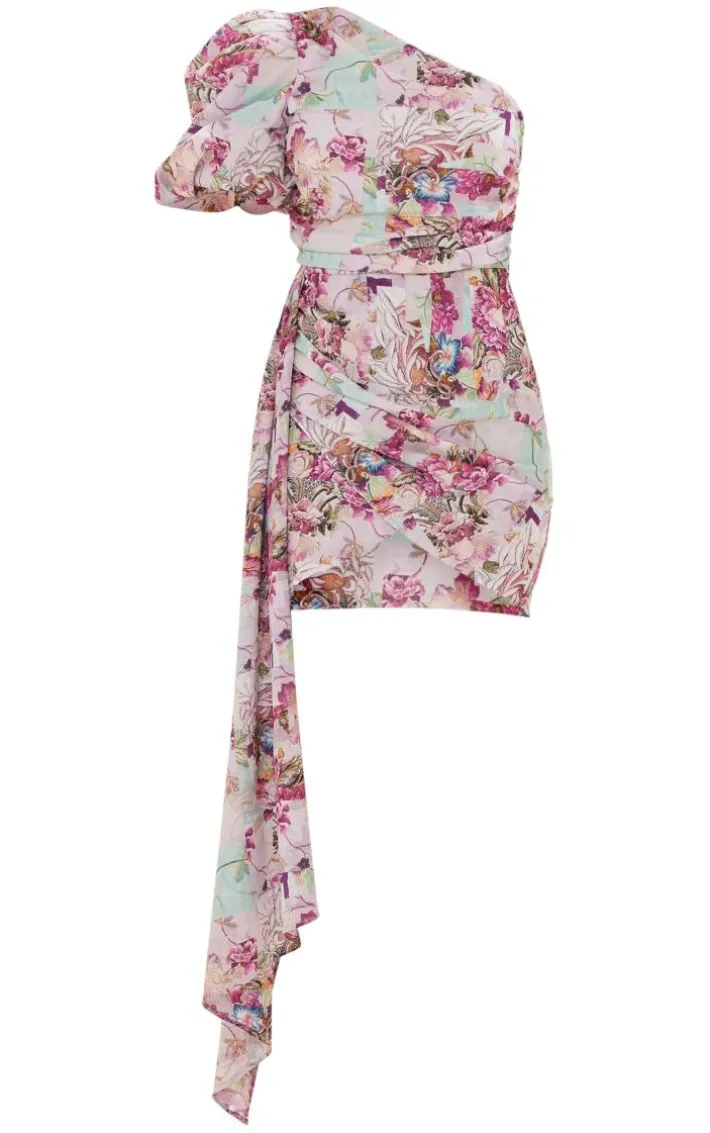 Add some of this seasons must-have prints into your weekend wardrobe with this pink abstract floral one shoulder puff sleeve drape bodycon dress. Brought to you in a pink abstract floral print material with a one-shoulder design, a puff ball sleeves and draped detailing and a figure-hugging fit, how could you resist? To level up the look pair this with your clear high heels and accessories for a look that will turn heads for all the right reasons.