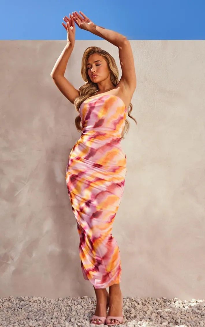 Say hello to this must-have pink abstract print mesh bandeau ruched maxi dress which is perfect for every occasion. If you have an invitation to your fave ‘s wedding then this maxi dress ticks all the dress code boxes. With a pink abstract print mesh material, bandeau neckline, and ruched detailing, how could you say no? Team this maxi dress with your dreamy heels and gold accessories for a look that won’t go unnoticed.