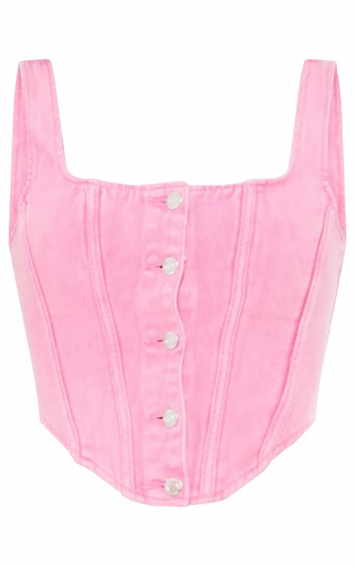 Found some last-minute weekend plans and need an unreal ‘fit? Then we have you covered with this styling staple, a pink button detail boned denim corset top. With a pink denim material with boned detailing and a corset style, we’re obsessed. Work your styling techniques and add a the matching skirt, platform sandals and accessories for a look that will gain all the likes.