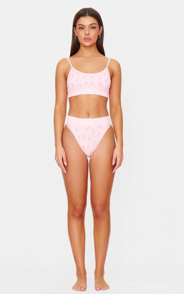 Opt for this pink candy cane ribbed thong for a look you can reach for in seasonal months and beyond. Brought to you in a luxe pink hue, with a festive candy cane print design and cosy ribbed material, what more could you want? Pair with the matching bralette and gold accessories to complete the look.