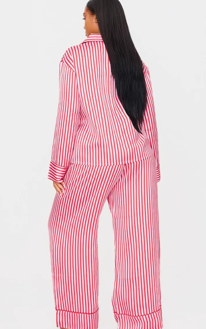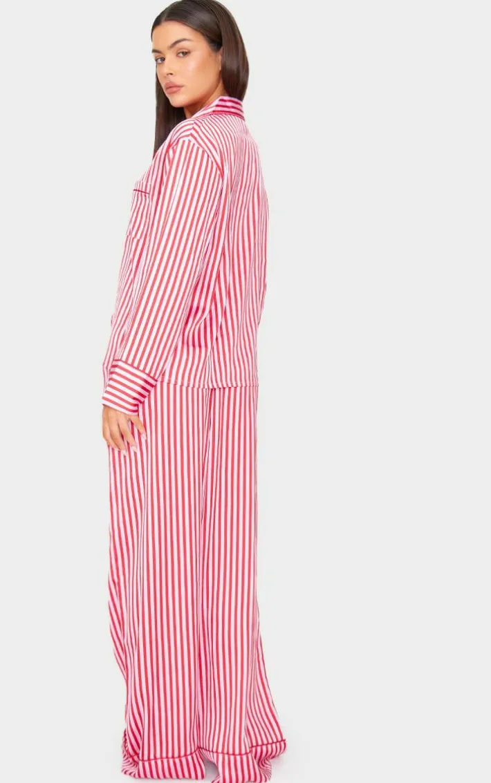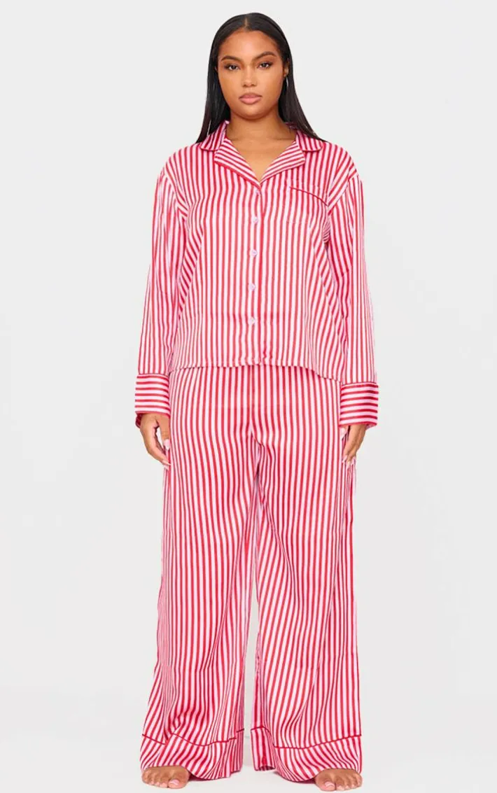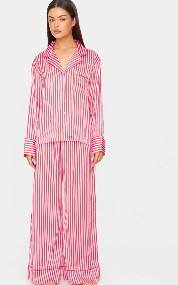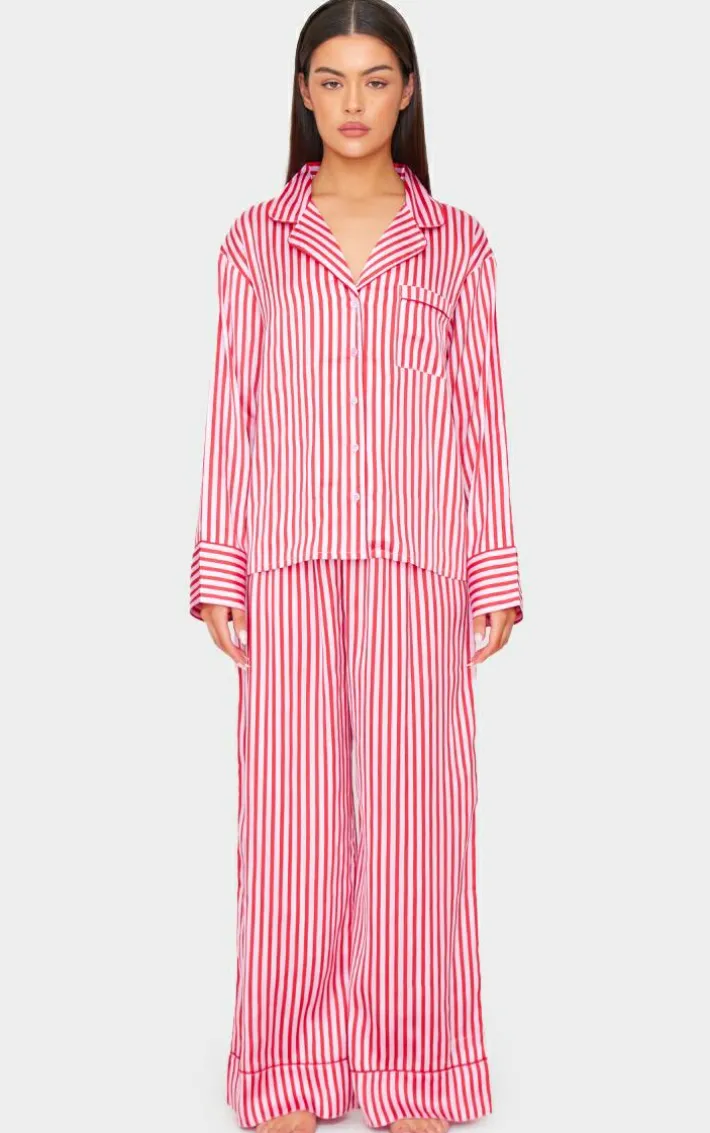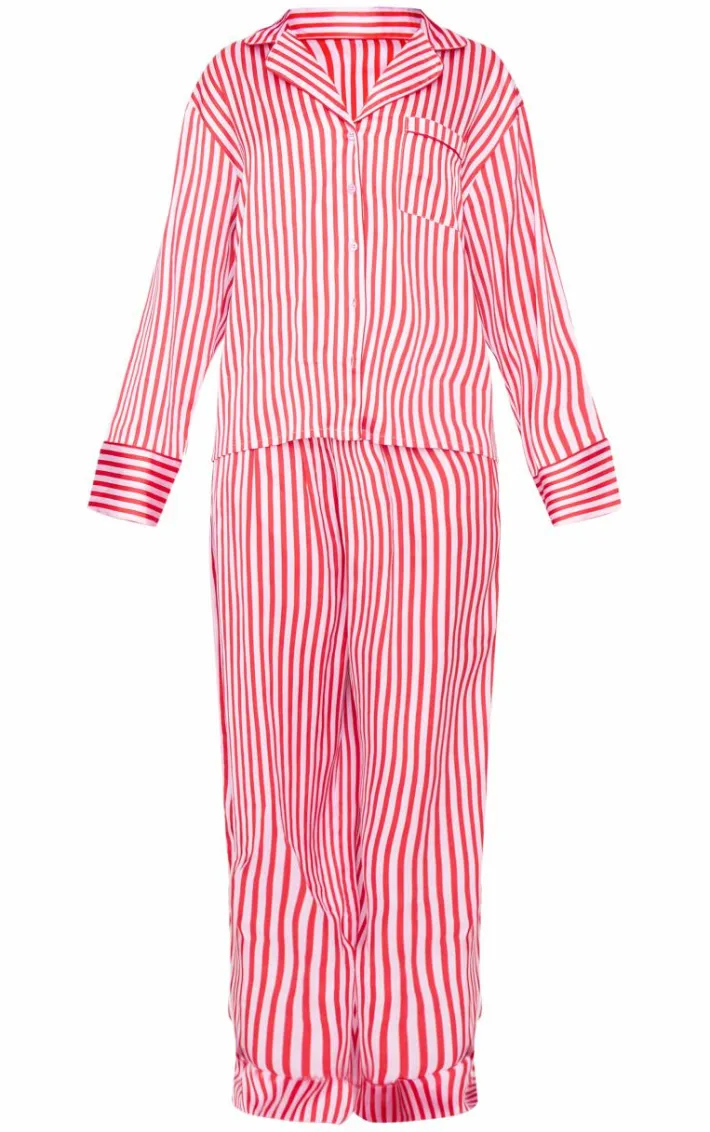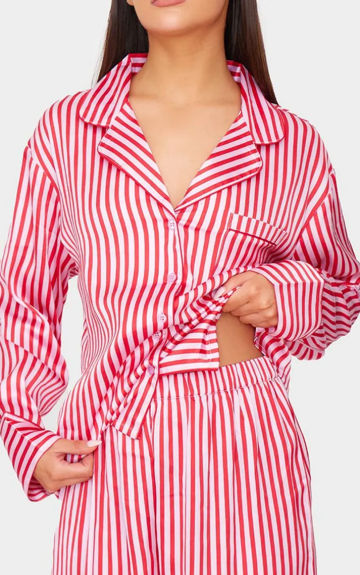 Add this pink candy stripe satin long PJ set to your collection. Brought to you in a statement pink shade, with a luxe candy stripe design and satin material, this PJ set is sure to have you feeling cosy. Why not team with a pair of slippers and an eye mask? It’s a yes from us.