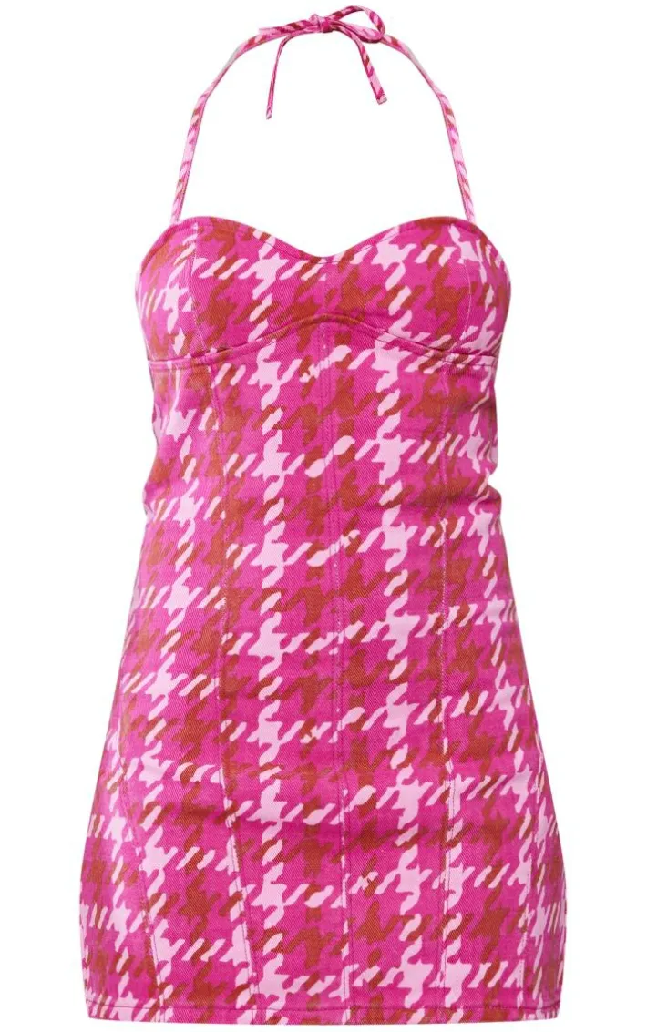 Get ready to serve up nothing but heat with this pink check print halterneck denim dress. Brought to you in a denim material with a pink check print hue along with a halterneck design and a figure-hugging fit to compliment your curves, how could you say no? We are loving this paired with a faux leather jacket, chunky boots and accessories for a next-level look.