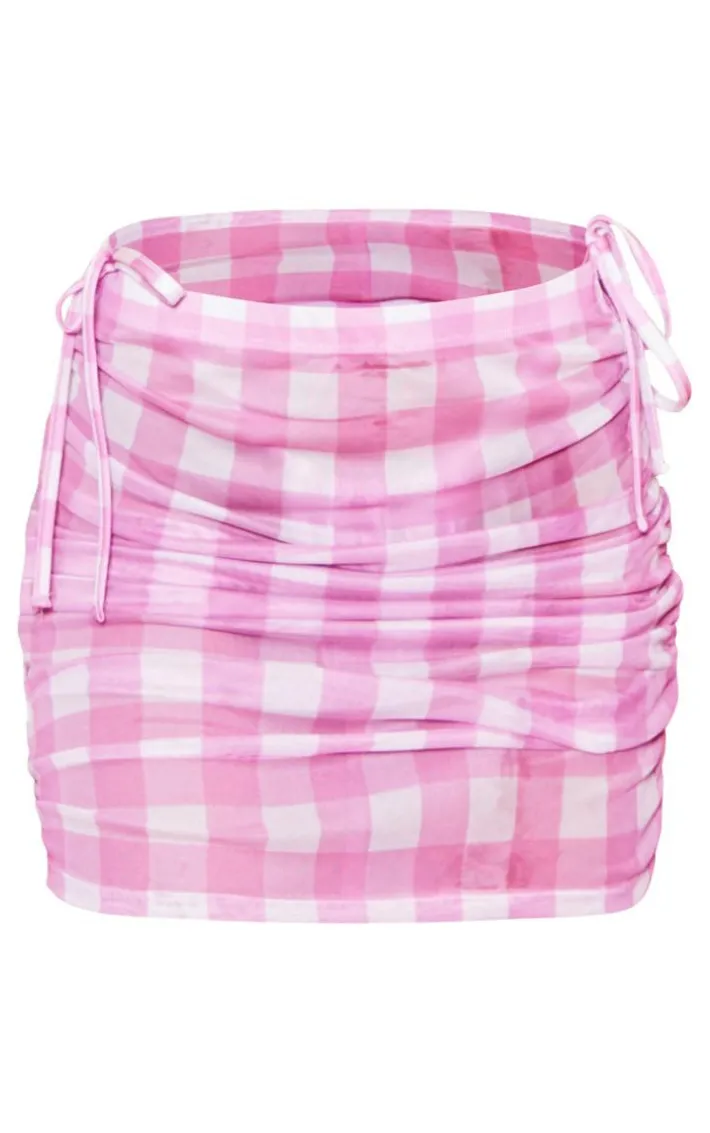 Take your poolside look to new levels with this pink checkerboard ruched mesh beach skirt. This beach skirt is made from a pink mesh material for a little added edge, we are obsessed. With a checkerboard design and a ruched detail, this skirt is perfect for those beach days. Team with the matching bikini to complete the look everyone will be talking about.