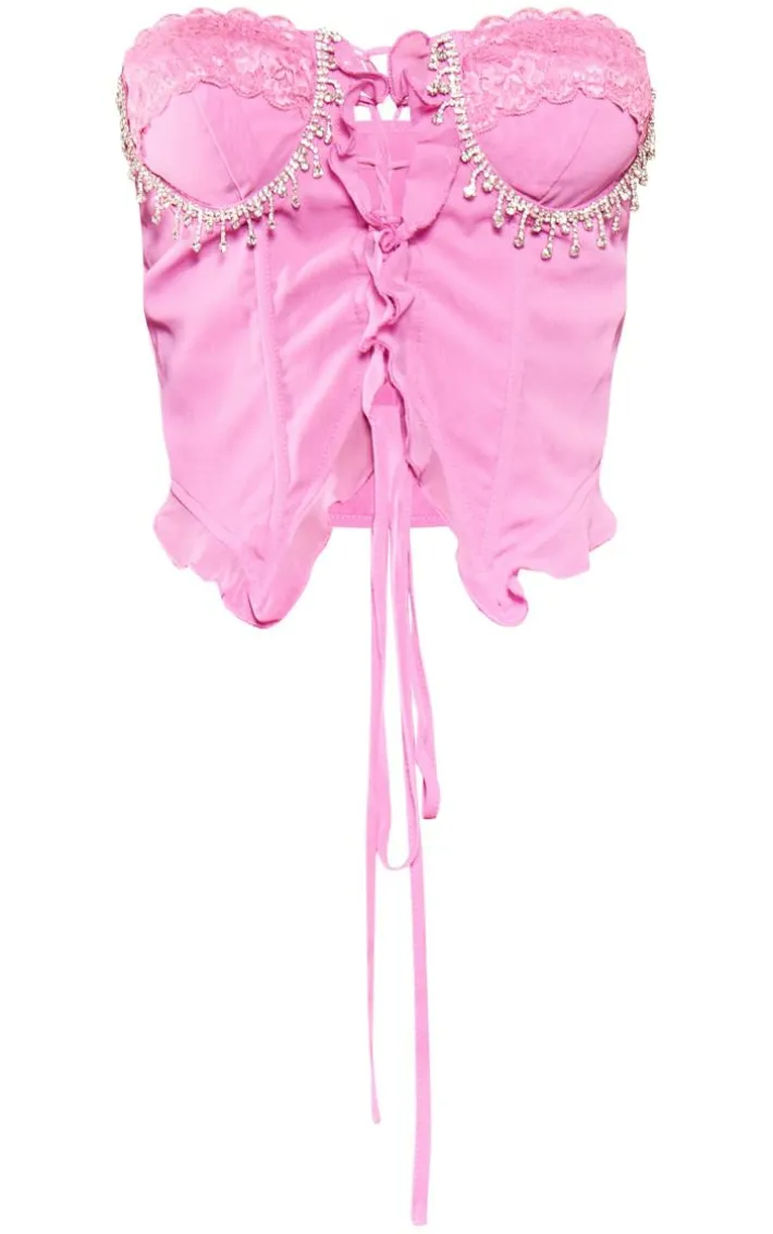 This pink chiffon boned diamante trim lace up bandeau crop top is here to banish any of your what to wear dilemmas. Brought to you in a pink chiffon material with a boned design, we can’tget enough. From start to finish it’s diamante detailing and trim lace up fastening will have you looking totally on-trend. For a next-level look simply style with a mini skirt and your fave heels. It’s a yes from us.
