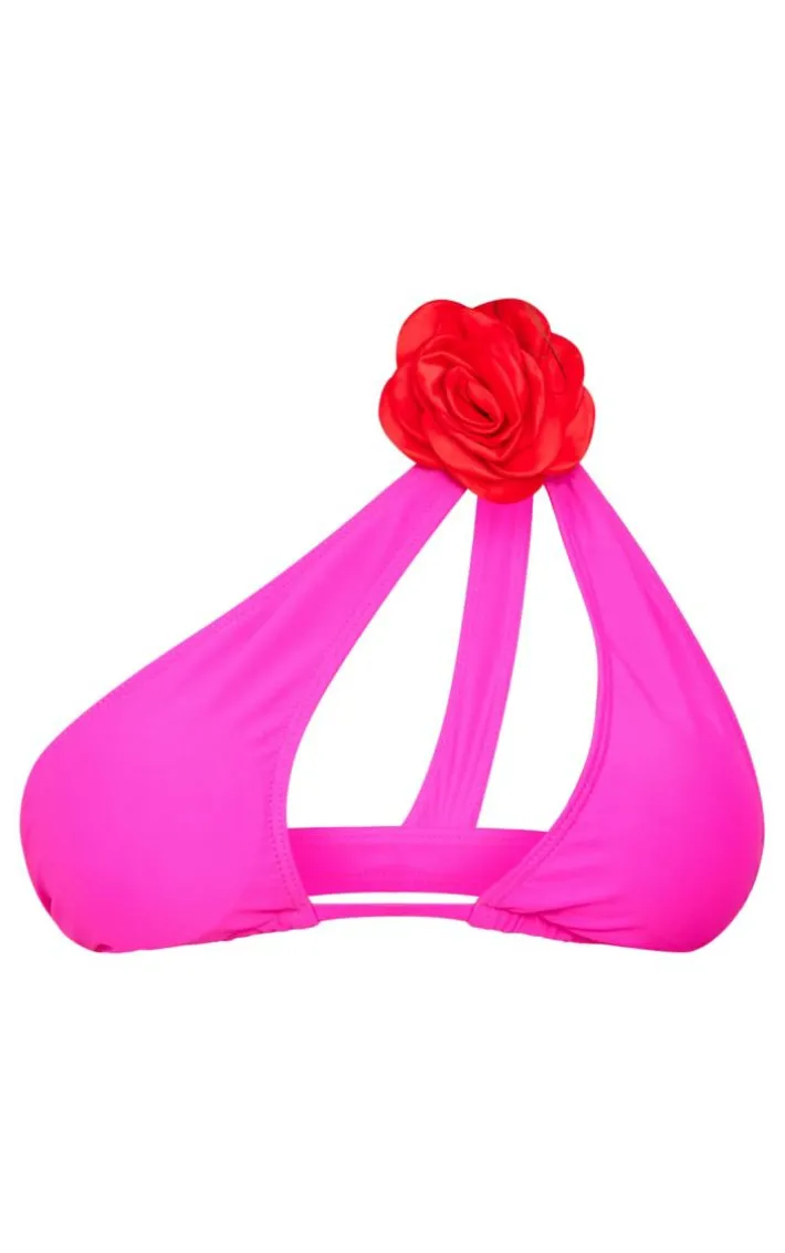Give your poolside look a pop of pink with this pink contrast flower detail triangle bikini top. Brought to you in a pink hue material with a triangle cup design and contrasting flower detailing for that extra touch of glam, what more could you need? Style this bikini top with the matching bikini bottoms and statement accessories for a look that is sure to make a serious style statement on your next vacay.
