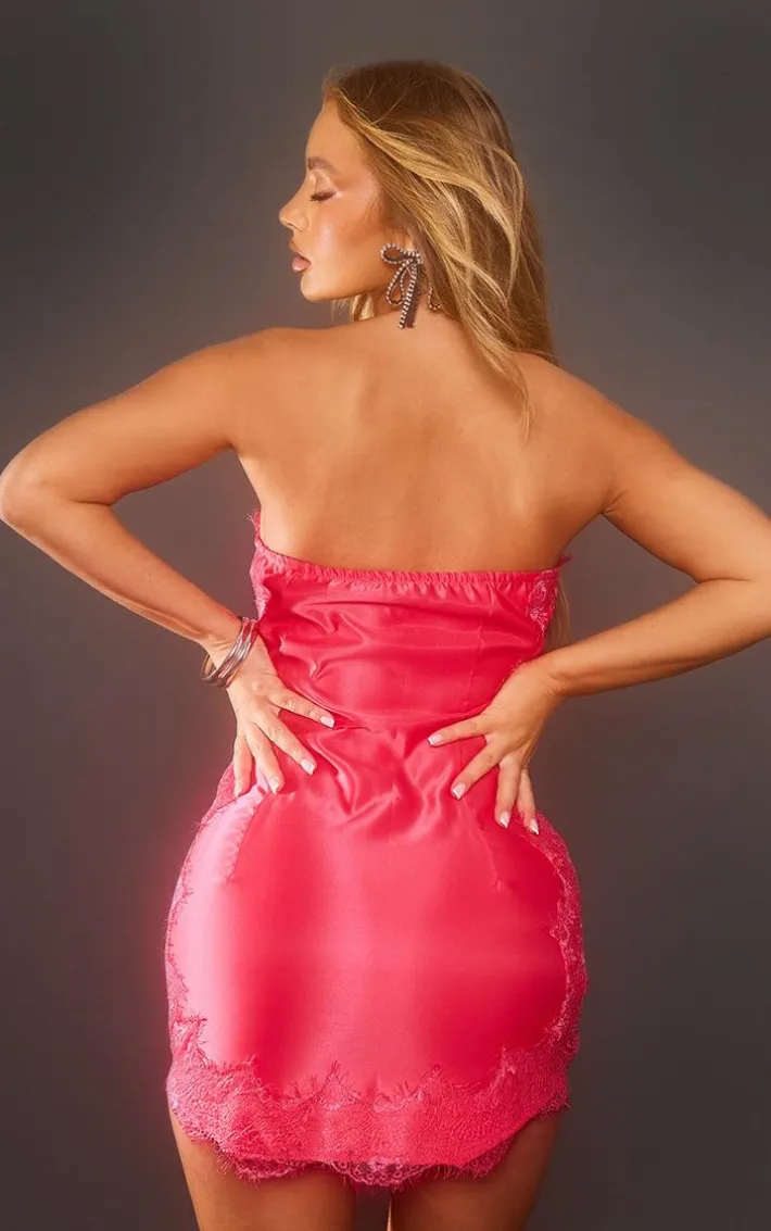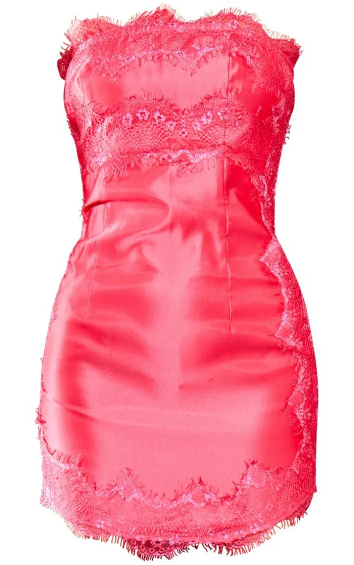 Add a pop of pink into your weekend wardrobe with this pink lace trim satin tailored bandeau bodycon dress. This dress is brought to you in a pink satin material with a lace trimand a tailored fit, what more could you ask for? This dress with it’s figure-hugging fit will have all eyes on you. Complete the look by adding your dreamy high heels and accessories for a vibe like no other.