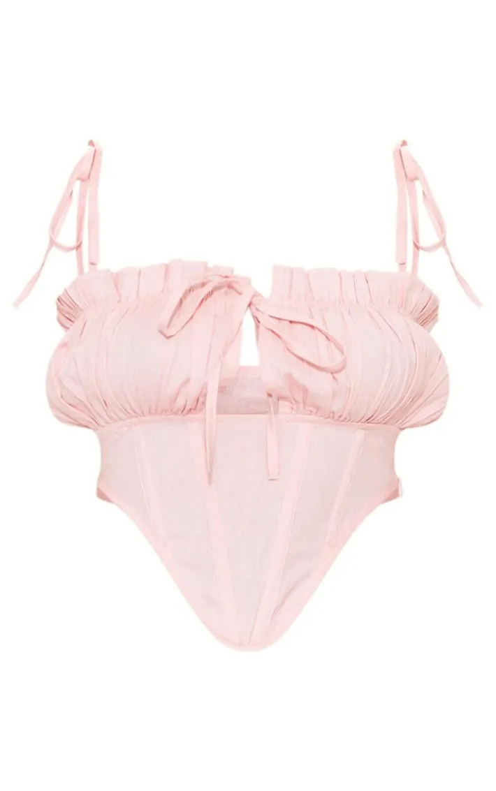 Get your wardrobe ready for the new season with this pink linen look pleated bust tie shoulder crop top. Brought to you in a pink linen look material with a pleated bust detail and tie-shoulder design, we’re obsessed. Whether you dress this crop top up for your weekend plans or give your off-duty look a refresh, you will be able to style this top for this season and beyond. Team with denim jeans, chunky sandals and gold accessories for a look everyone will be jealous of.