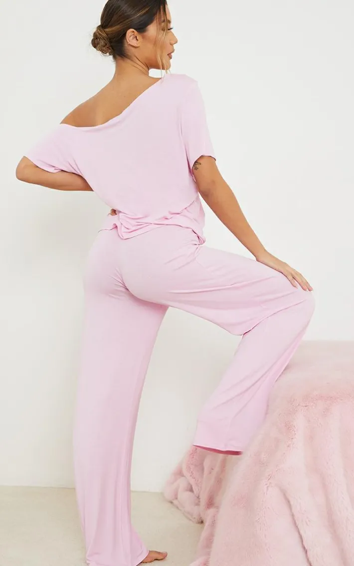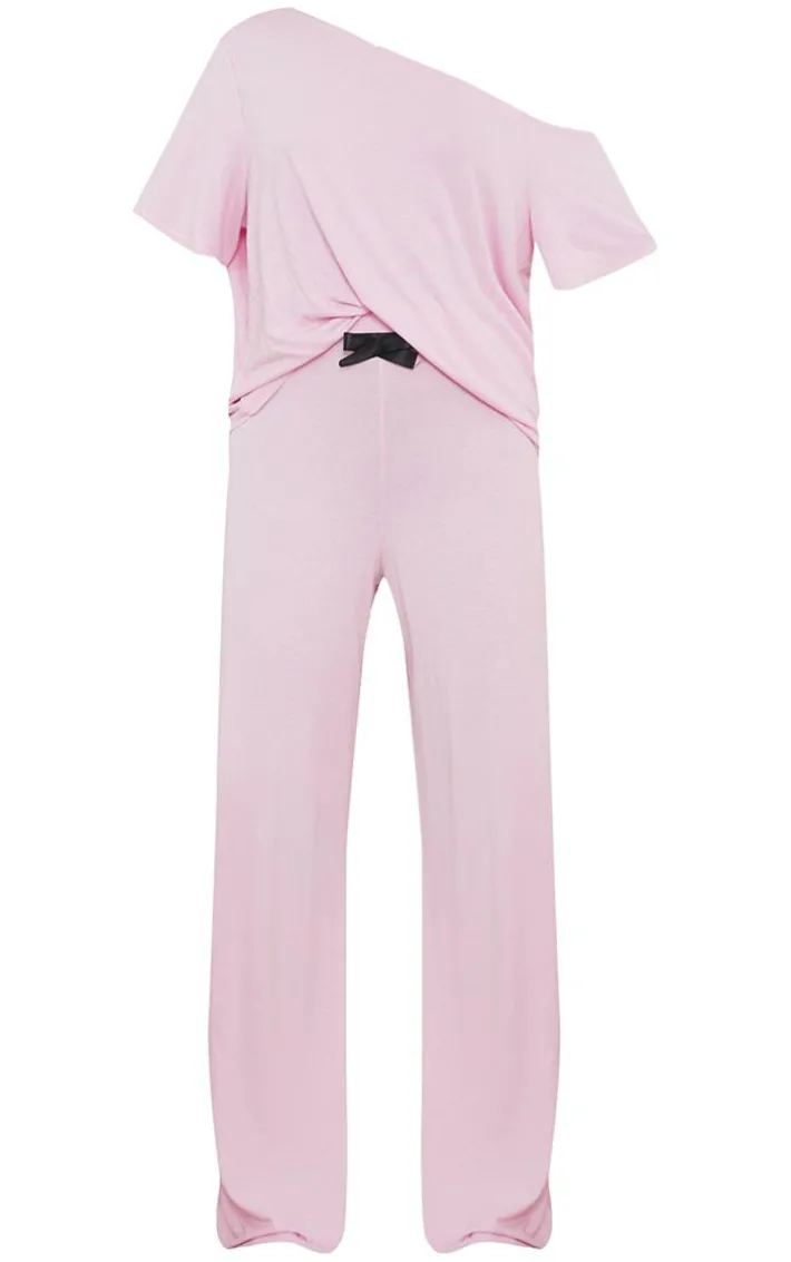 Get ready for the perfect nights sleep with this PJ set. Featuring an off-the-shoulder top and bottoms, both in a pink material with a relaxed fit, we are obsessed. Team these with fluffy slippers and a night mask to complete your after-dark look.