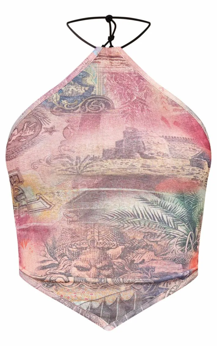 It’s official, we’re obsessed with this pink printed mesh halter neck crop top. Brought to you in a pink hue mesh material with a printed design and halter neck detail, this crop top is a must-have. How can you resist? Style with statement jorts, clear heels and gold accessories for a bold finish. It’s a yes from us.