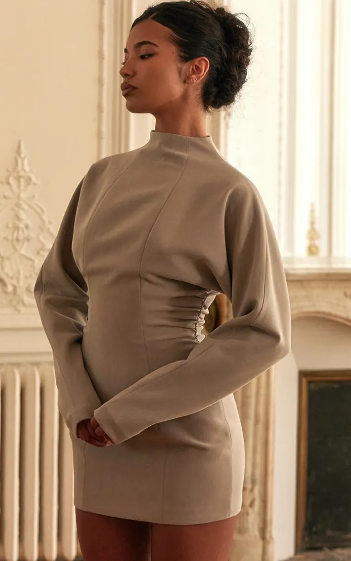 You’re going to look the best dressed for any event with our PLT label taupe batwing sleeved pleated bodycon dress. Brought to you in a timeless taupe hue, unreal batwing sleeve design and statement pleated front, we are obsessed. Shop the look and add a pair of slip on heels and stud earrings for an understated yet on-point look.