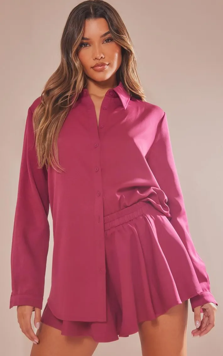 Inject some dreamy hues into your new season wardrobe with this plum long sleeve oversized shirt. Brought to you in a plum hue material with long sleeves, abutton down front and an oversized fit, what more could you want? We are loving this oversized shirt styled with the matching shorts and your fave pair of heels for an effortlessly chic look that won’t go unnoticed.