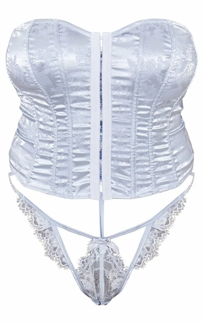 Have hearts racing for all the right reasons with this baby blue plus jacquard satin boned corset. Brought to you in a baby blue satin material with a jacquard design and boned detailing, what’s not to love ? Team with the matching thong and your go-to accessories for a fool proof finish everyone is obsessing over.
