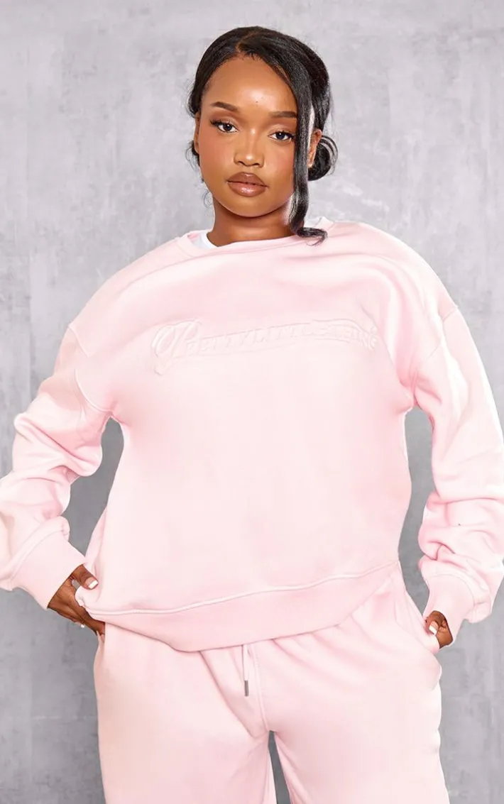 Add a pop of pink to your off-duty look with this plus baby pink embossed Graphic oversized Sweatshirt. Made from a baby pink hue material with an embossed design and an oversized fit, what’s not to love? Pair this oversized Sweatshirt with the matching sweatpants, sneakers and simple gold accessories for a chilled look that will make you stand out from the rest.