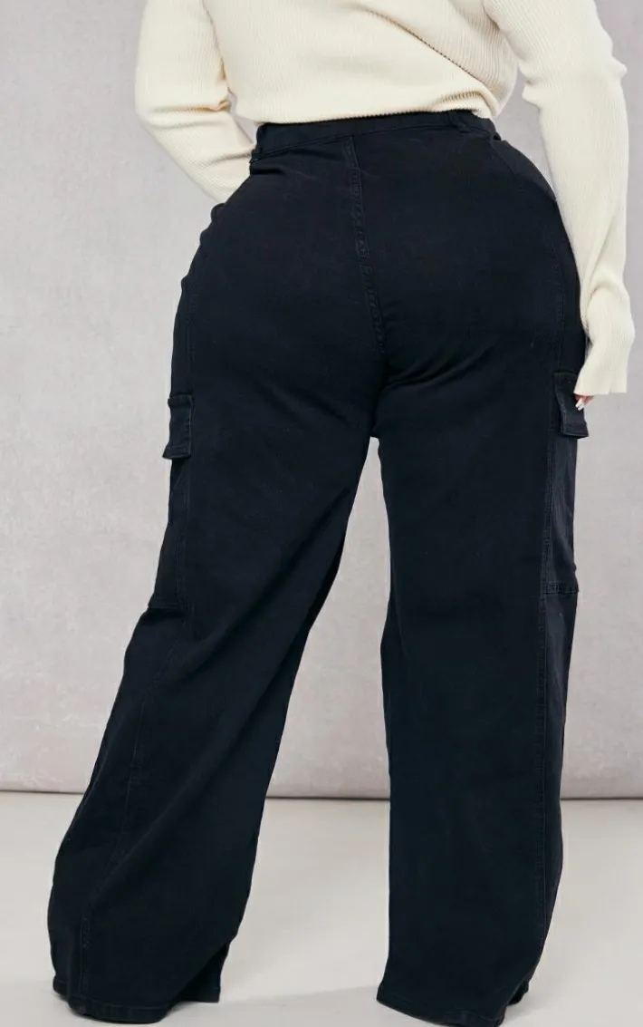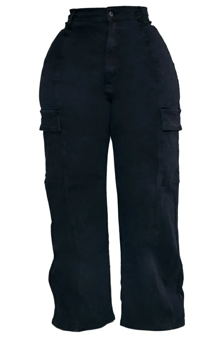 Get your style game on point with these cargo jeans. Featuring a black denim material with pocket detail and a wide-leg fit. Pair with a basic top and faux leather jacket to complete this dreamy look.