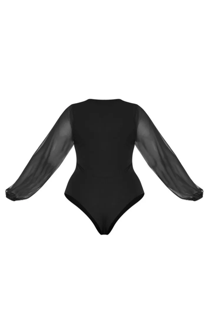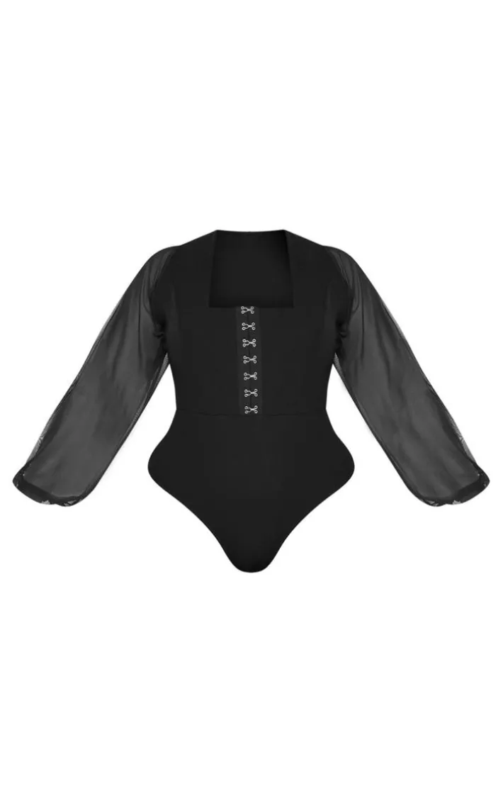 This black bodysuit is a new season go-to. Featuring a black mesh sleeved design with an eyelet detailing and a square neckline, style with shorts and mules for an all-black ensemble we’re loving.