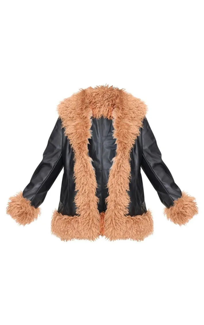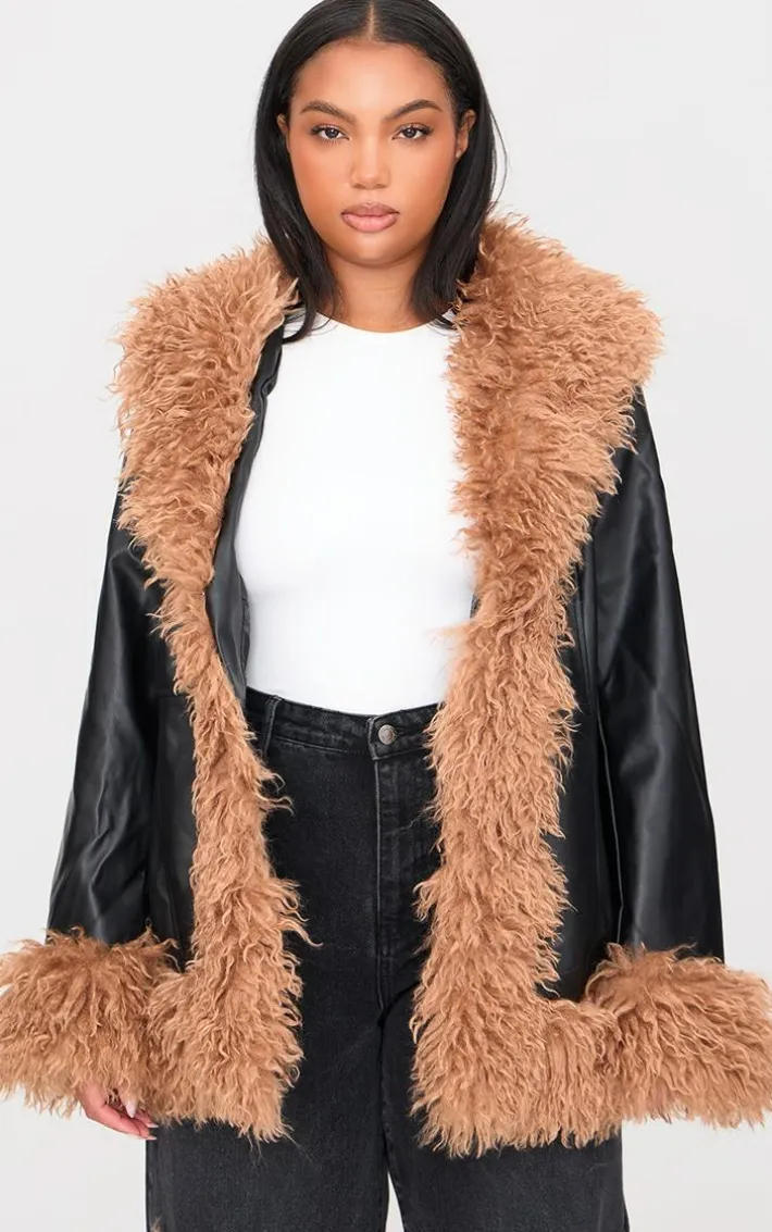 Whether you have brunch plans in your diary, or a special occasion coming up, this plus black faux mongolian fur trim faux leather jacket is perfect for you. Brought to you in a black faux mongolian material with a fur trim detail and a faux leather design, we just can’t get enough. Pair with your outfit of the day for a look that will get you noticed.