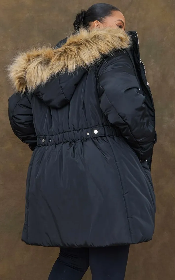 This season a padded coat is essential and we are loving this style. Featuring a black material with an elasticated waist and a fur hood, we’re obsessed. Team with your off-duty essentials to complete the look.