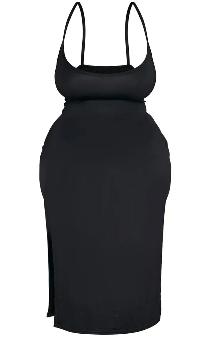 This black jersey midi dress is sure to give your look a super chilled but chic vibe. Featuring a black jersey fabric with thin shoulder straps and a midi length, dress it up with a pair of lace-up heels and hoop earrings.
