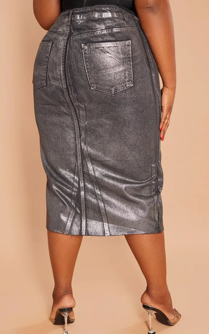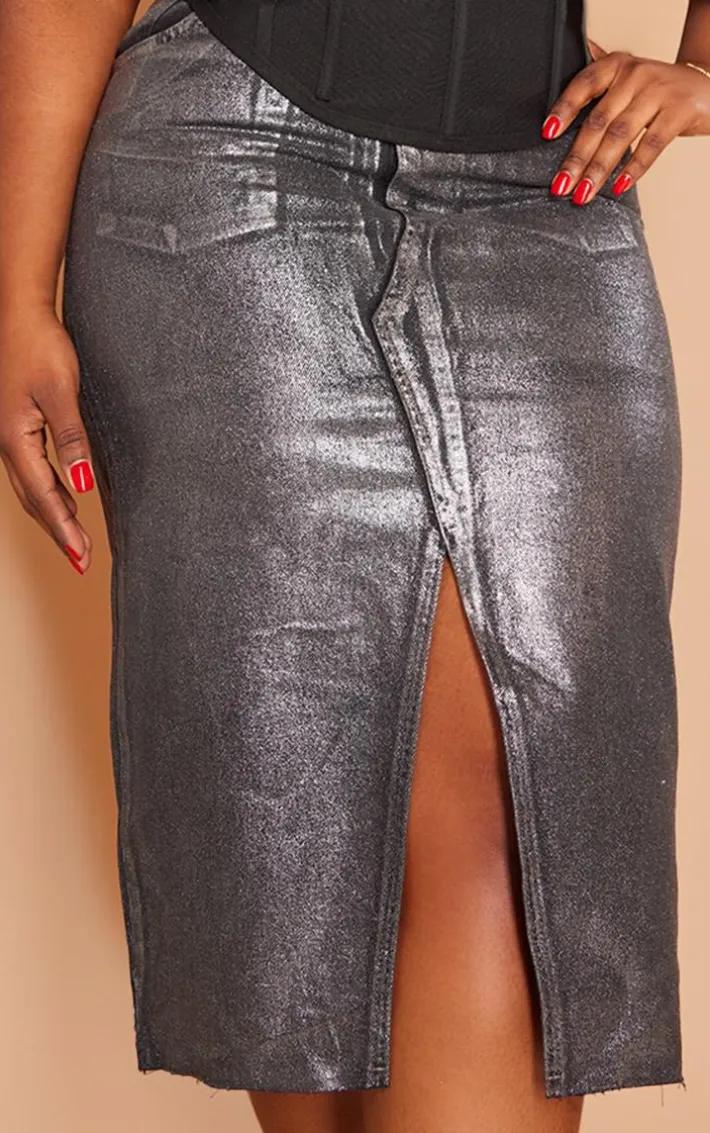 Level up your denim collection with this plus black metallic detail midi denim skirt. This skirt is brought to you in a black metallic material with a midi length and a figure-hugging fit, what’s not to love? This denim skirt is everything and more we’re loving paired with a black top, high heels and accessories for a look that we can’t stop loving.