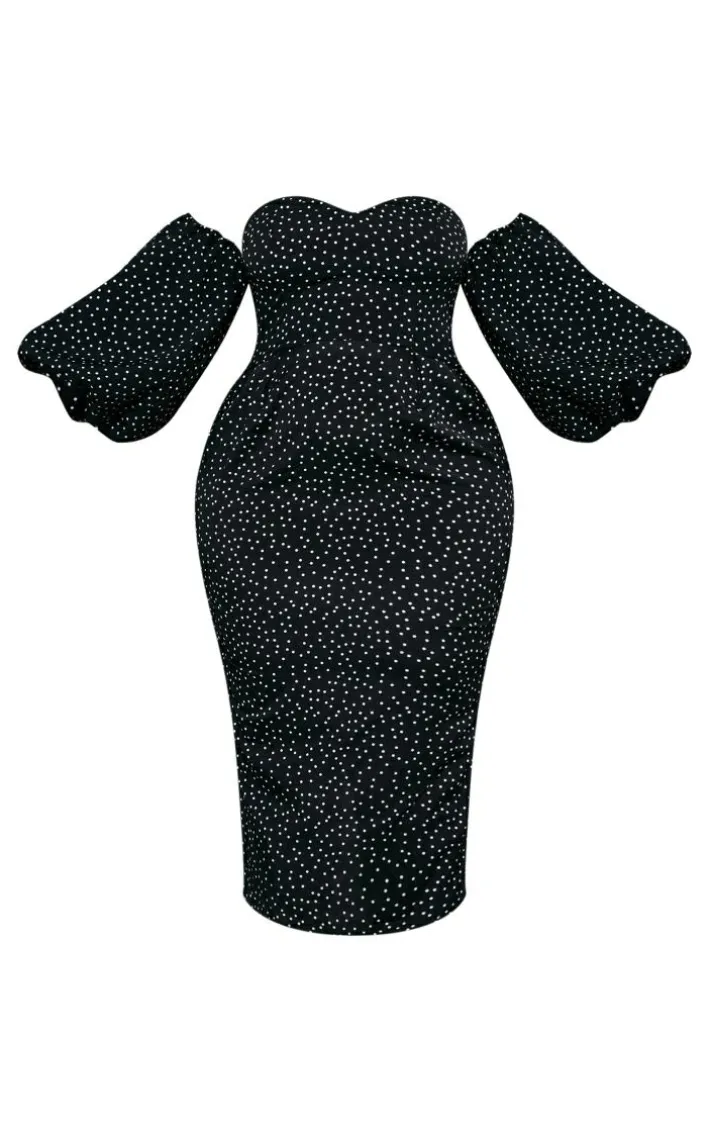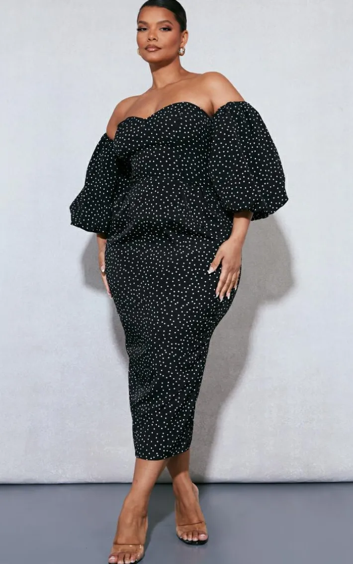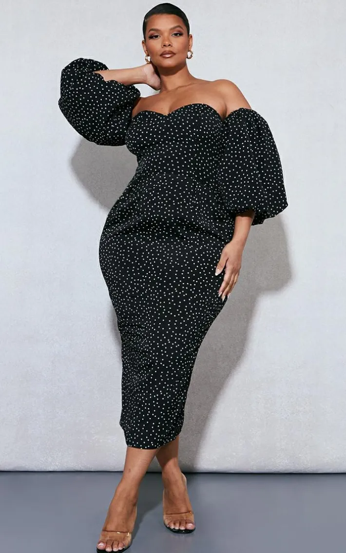 Channel all the glam vibes into your weekend wardrobe with this plus black polka dot bandeau puff sleeve midi dress. Brought to you in a black polka dot material with a bandeau neckline and puff sleeves, how could you say no? This plus midi dress is the answer to all your what-to-wear dilemmas. Style effortlessly with gold accessories and clear heels for a dreamy finish that is sure to get everyone talking.