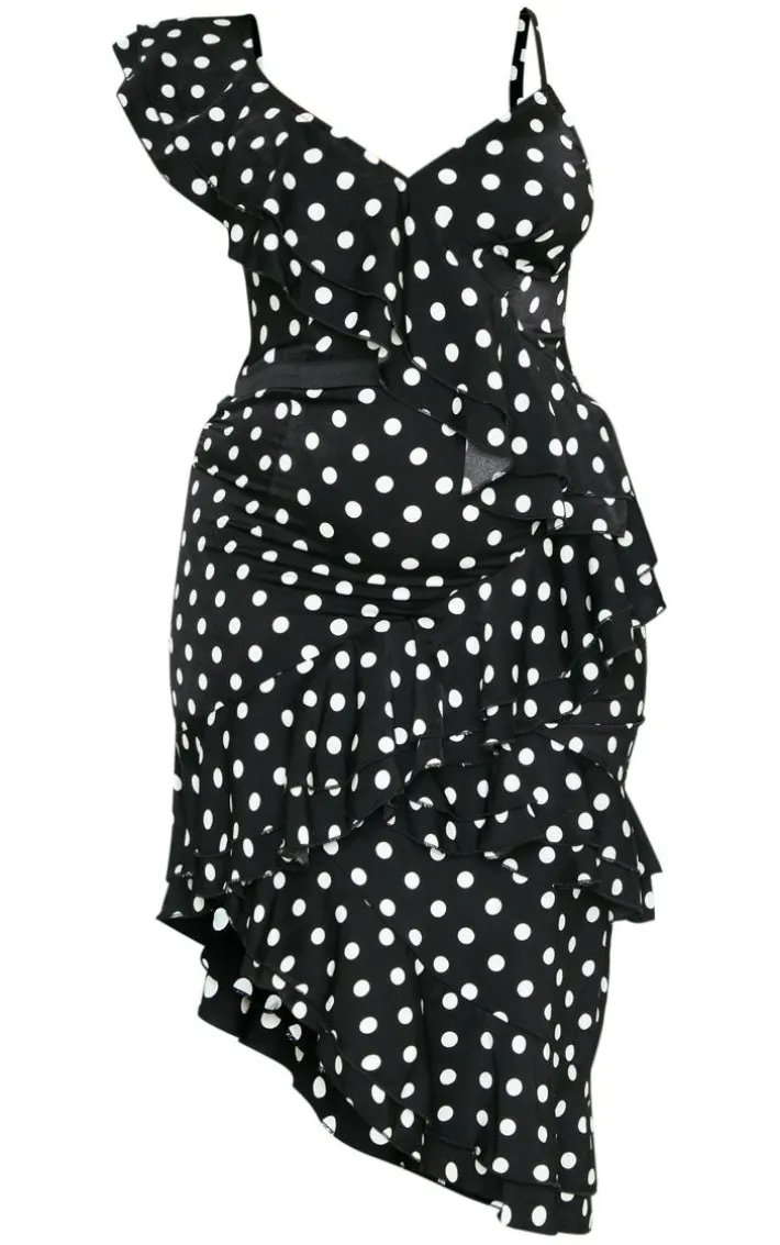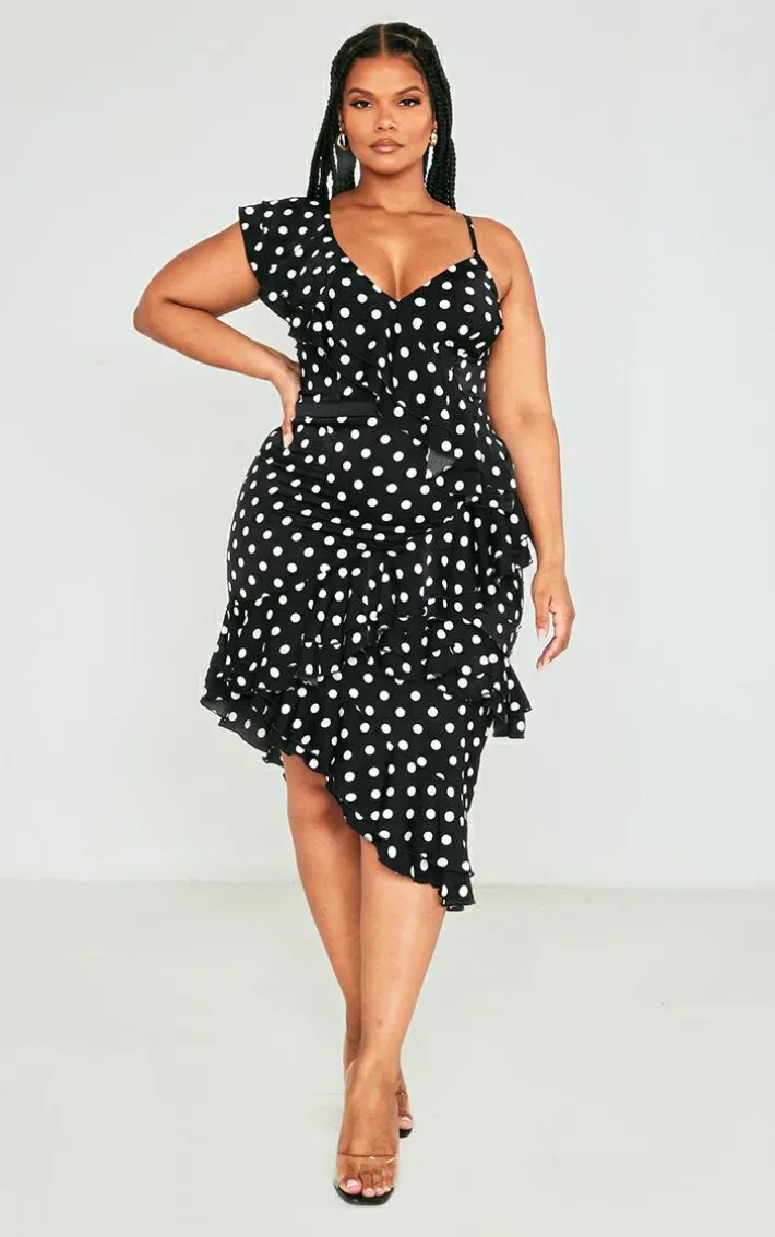 Got a special occasion pencilled into your diary ? Then this black polka dot ruffle detail midi dress is sure to earn you all the style points. It features a black material with a polka dot print, ruffle detailing and a midi length, how could you not be in love? Style this plus midi dress with clear heels and minimal accessories for a look that everyone will be obsessing over.