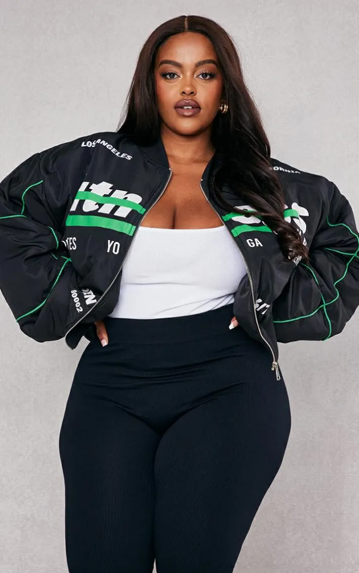 Max out any look with this plus black printed nylon bomber jacket doll. It’s perfect for your everyday collection and beyond. Made using a black nylon material with a front print and a relaxed fit for those comfy days, what more could you ask for? This plus jacket sure to be a staple in your collection. Simply pair with leggings, a bodysuit, fresh sneakers and a bag for a fresh vibe that no one will see coming.