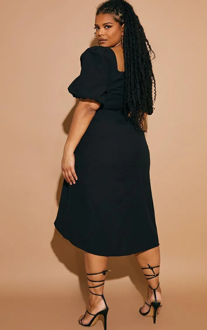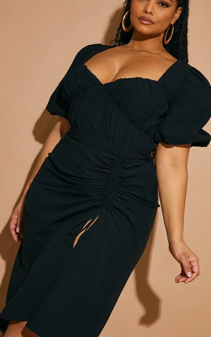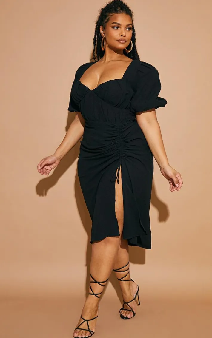 Your new season wardrobe never looked so good than with this plus black puff sleeve ruched split side midi dress. Brought to you in a black material with a ruched split side design and puff sleeves, how could you not be obsessed? Perfect for those weekend plans, this plus midi dress is sure to impress. Just add tie-up heels and your fave accessories for a look that is perfect for your weekend plans.